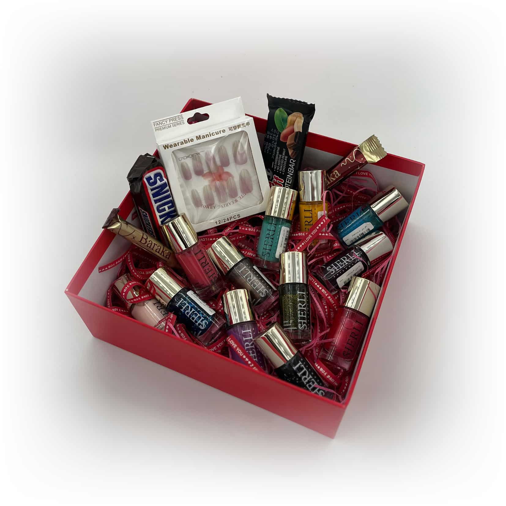 در این باکس ولنتاینی چند عدد لاک از برند شرلی با رنگ بندی متنوع قرار گرفته است که برای سلیقه های مختلف مناسب هستند. رنگها بهگونهای انتخاب شدهاند که هم برای استفاده روزمره و هم برای استایل های خاص و عاشقانه ولنتاین کاربرد داشته باشند.